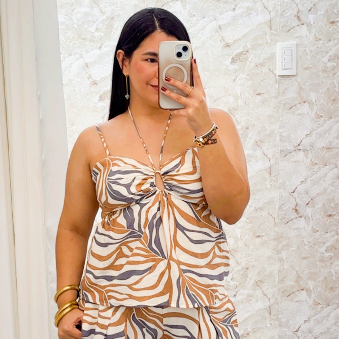 Abstract Top es 80% rayón y 20% nylon. Su forro es 100% polyester. Sus straps son ajustables tiene elástico y lazo en la parte de atrás. Corre al size, Erika lo lleva tamaño mediano.
