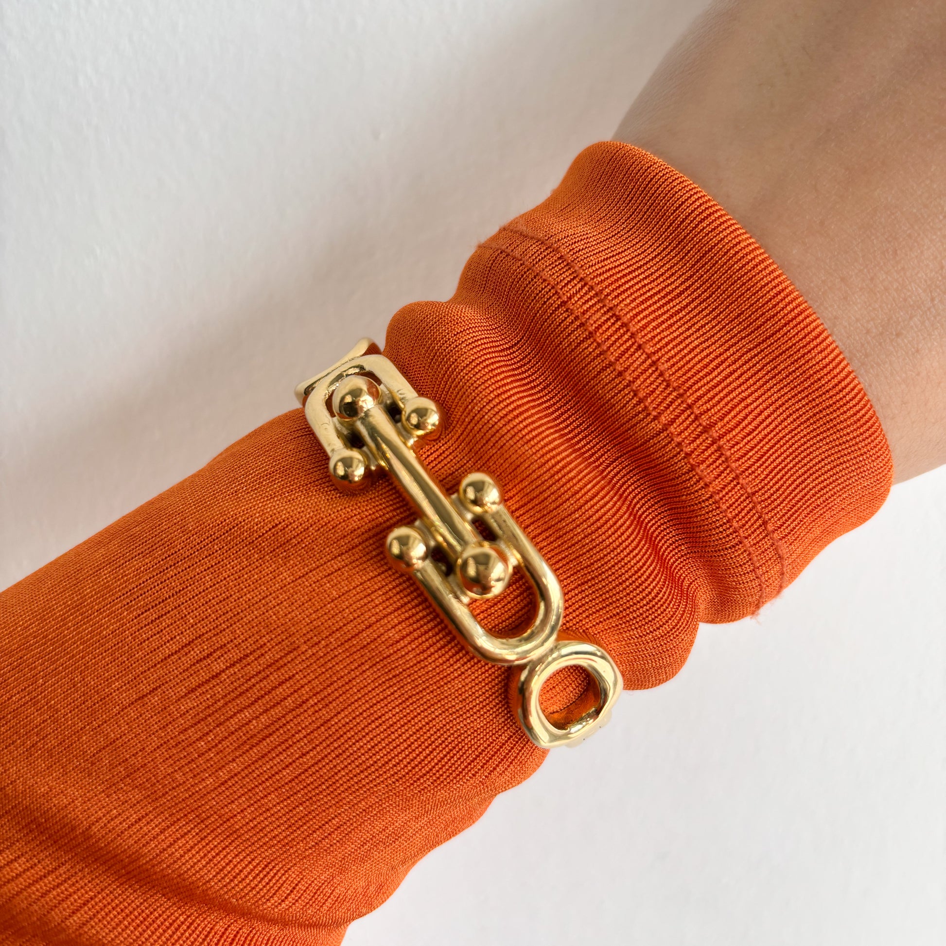 Knot Gold Bangle es de acero inoxidable y mide 3 cm.